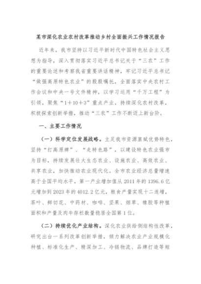 / 【七哥公文】2024年:某市深化农业农村改革推动乡村全面振兴工作情况报告+更多免费公文+VX:QiGeGongWen2024