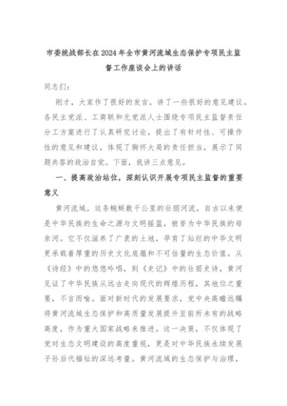 【七哥公文】2024年:市委统战部长在2024年全市黄河流域生态保护专项民主监督工作座谈会上的讲话+更多免费公文+VX:QiGeGongWen2024