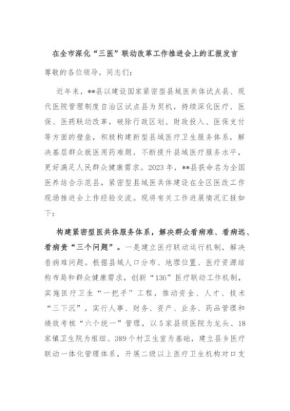 / 【七哥公文】2024年:在全市深化“三医”联动改革工作推进会上的汇报发言+更多免费公文+VX:QiGeGongWen2024