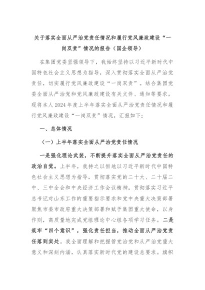 【七哥公文】2024年:关于落实全面从严治党责任情况和履行党风廉政建设“一岗双责”情况的报告(国企领导)+更多免费公文+VX:QiGeGongWen2024