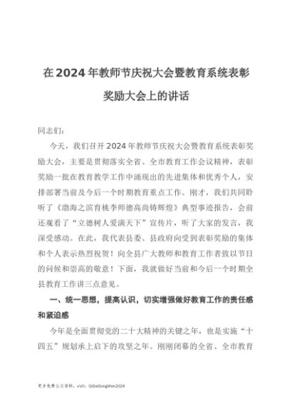 【七哥公文】2024年:在2024年教师节庆祝大会暨教育系统表彰奖励大会上的讲话+更多免费公文+VX:QiGeGongWen2024