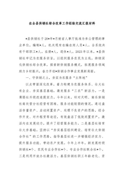 / 【七哥公文】2024年:在全县供销社综合改革工作经验交流汇报材料+更多免费公文+VX:QiGeGongWen2024