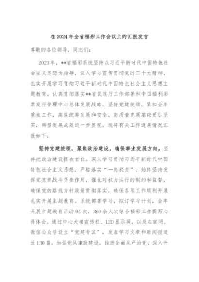 / 【七哥公文】2024年:在2024年全省福彩工作会议上的汇报发言+更多免费公文+VX:QiGeGongWen2024
