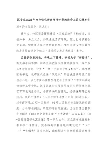 【七哥公文】2024年:区委在2024年全市优化营商环境专题推进会上的汇报发言+更多免费公文+VX:QiGeGongWen2024