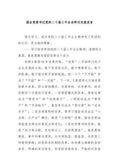/ 【七哥公文】2024年:国企党委书记党的二十届三中全会研讨交流发言+更多免费公文+VX:QiGeGongWen2024