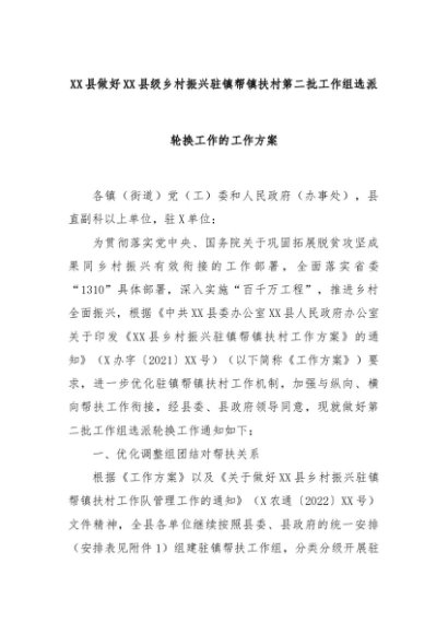 【七哥公文】2024年:XX县做好XX县级乡村振兴驻镇帮镇扶村第二批工作组选派轮换工作的工作方案+更多免费公文+VX:QiGeGongWen2024