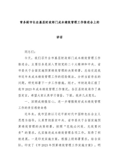 【七哥公文】2024年:常务副市长在基层财政部门成本绩效管理工作推进会上的讲话+更多免费公文+VX:QiGeGongWen2024