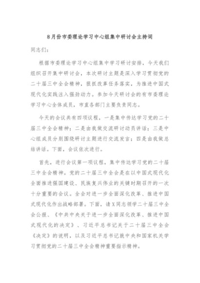 / 【七哥公文】2024年:8月份市委理论学习中心组集中研讨会主持词+更多免费公文+VX:QiGeGongWen2024