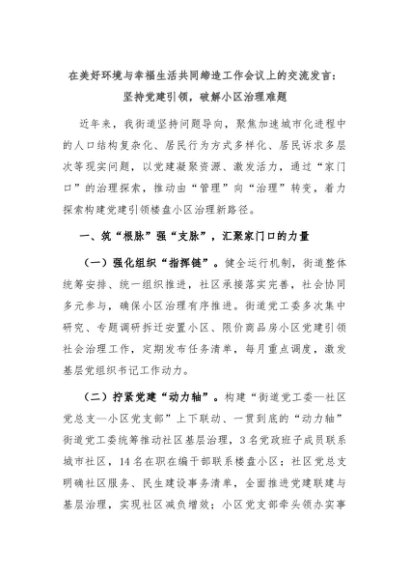 【七哥公文】2024年:在美好环境与幸福生活共同缔造工作会议上的交流发言:坚持党建引领,破解小区治理难题+更多免费公文+VX:QiGeGongWen2024