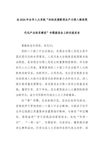 【七哥公文】2024年:在2024年全市人大系统“加快发展新质生产力深入推进现代化产业体系建设”专题座谈会上的交流发言+更多免费公文+VX:QiGeGongWen2024