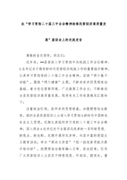 【七哥公文】2024年:在“学习贯彻二十届三中全会精神助推民营经济高质量发展”座谈会上的交流发言+更多免费公文+VX:QiGeGongWen2024