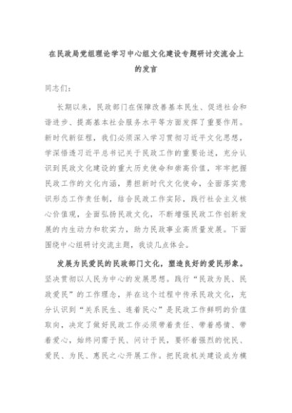 【七哥公文】2024年:在民政局党组理论学习中心组文化建设专题研讨交流会上的发言+更多免费公文+VX:QiGeGongWen2024