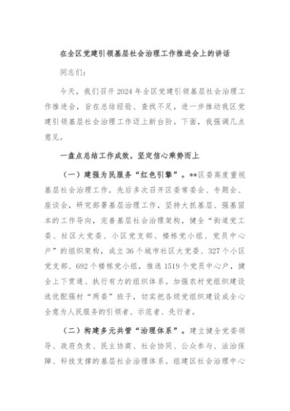/ 【七哥公文】2024年:在全区党建引领基层社会治理工作推进会上的讲话+更多免费公文+VX:QiGeGongWen2024