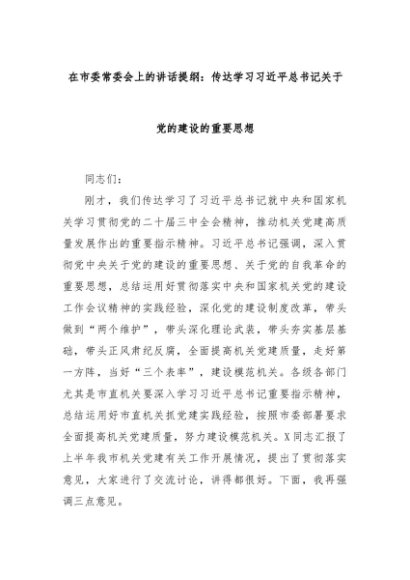【七哥公文】2024年:在市委常委会上的讲话提纲:传达学习习总书记关于党的建设的重要思想+更多免费公文+VX:QiGeGongWen2024