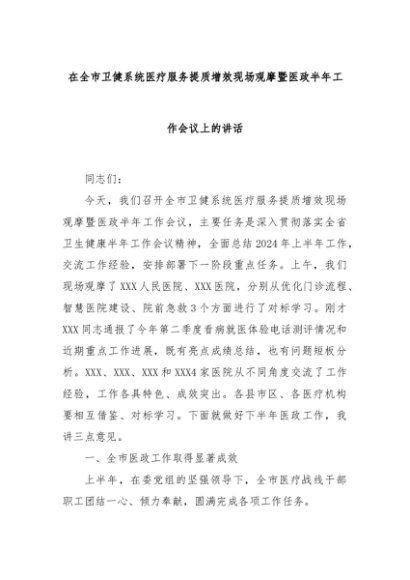 【七哥公文】2024年:在全市卫健系统医疗服务提质增效现场观摩暨医政半年工作会议上的讲话+更多免费公文+VX:QiGeGongWen2024