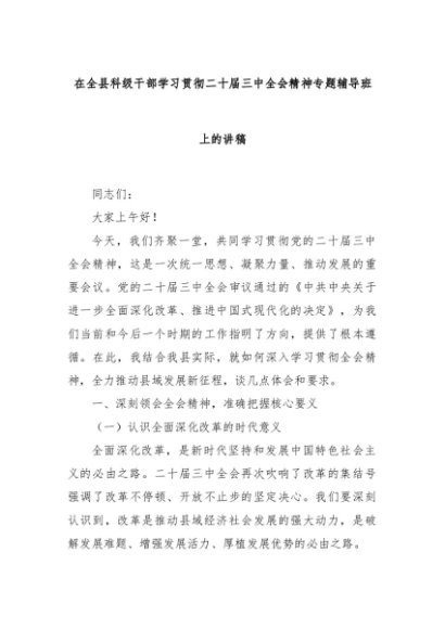 【七哥公文】2024年:在全县科级干部学习贯彻二十届三中全会精神专题辅导班上的讲稿+更多免费公文+VX:QiGeGongWen2024