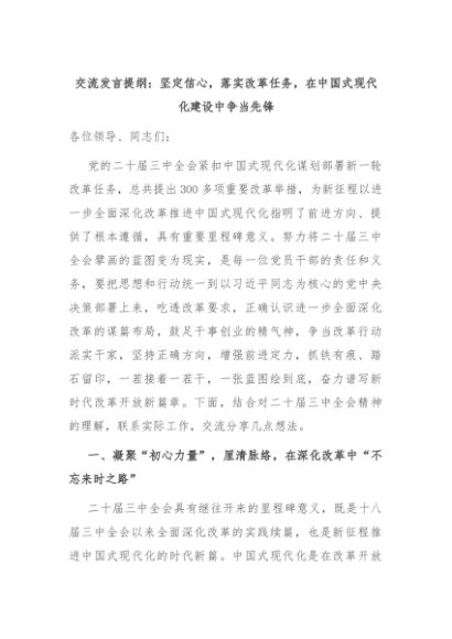 【七哥公文】2024年:交流发言提纲:坚定信心,落实改革任务,在中国式现代化建设中争当先锋+更多免费公文+VX:QiGeGongWen2024