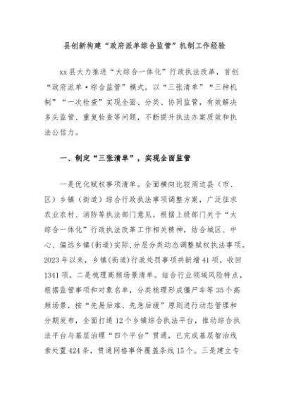 / 【七哥公文】2024年:县创新构建“政府派单综合监管”机制工作经验+更多免费公文+VX:QiGeGongWen2024