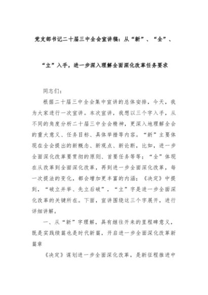 【七哥公文】2024年:党支部书记二十届三中全会宣讲稿:从“新”、“全”、“立”入手,进一步深入理解全面深化改革任务要求+更多免费公文+VX:QiGeGongWen2024