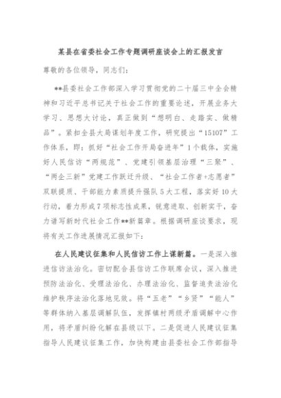 / 【七哥公文】2024年:某县在省委社会工作专题调研座谈会上的汇报发言+更多免费公文+VX:QiGeGongWen2024
