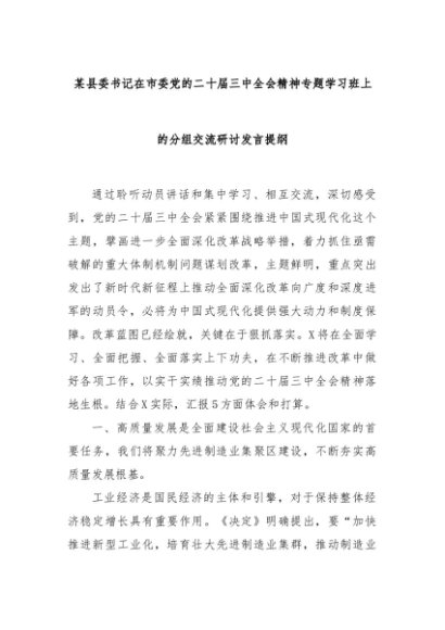 【七哥公文】2024年:某县委书记在市委党的二十届三中全会精神专题学习班上的分组交流研讨发言提纲+更多免费公文+VX:QiGeGongWen2024