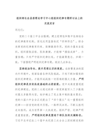 【七哥公文】2024年:组织部长在县委理论学习中心组组织纪律专题研讨会上的交流发言+更多免费公文+VX:QiGeGongWen2024