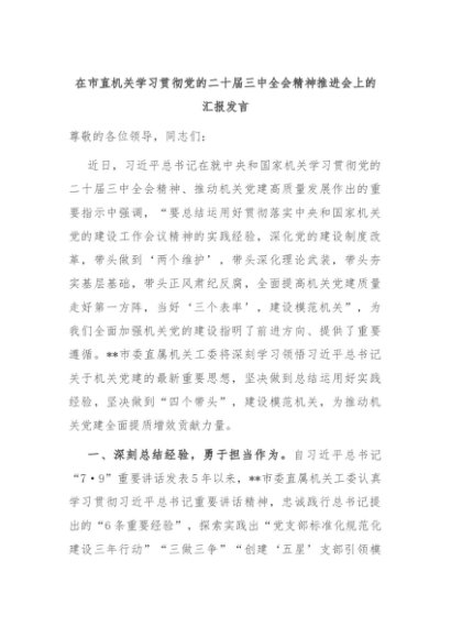 【七哥公文】2024年:在市直机关学习贯彻党的二十届三中全会精神推进会上的汇报发言+更多免费公文+VX:QiGeGongWen2024