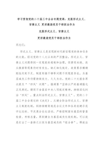 【七哥公文】2024年:学习贯彻党的二十届三中全会专题党课:克服形式主义、官僚主义 更好激励党员干部担当作为+更多免费公文+VX:QiGeGongWen2024