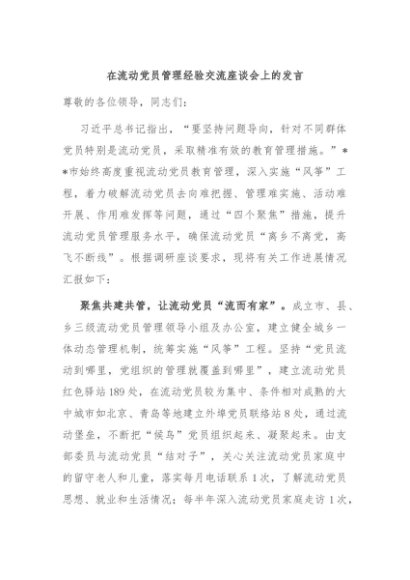 / 【七哥公文】2024年:在流动党员管理经验交流座谈会上的发言+更多免费公文+VX:QiGeGongWen2024