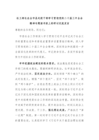 【七哥公文】2024年:社工部长在全市县处级干部学习贯彻党的二十届三中全会精神专题读书班上的研讨交流发言+更多免费公文+VX:QiGeGongWen2024