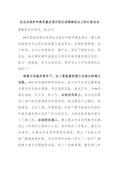 【七哥公文】2024年:在生态保护和高质量发展示范区创建推进会上的汇报发言+更多免费公文+VX:QiGeGongWen2024