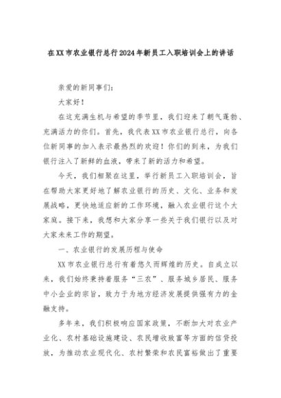 【七哥公文】2024年:在XX市农业银行总行2024年新员工入职培训会上的讲话+更多免费公文+VX:QiGeGongWen2024