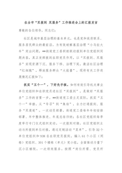 / 【七哥公文】2024年:在全市“双报到 双服务”工作推进会上的汇报发言+更多免费公文+VX:QiGeGongWen2024