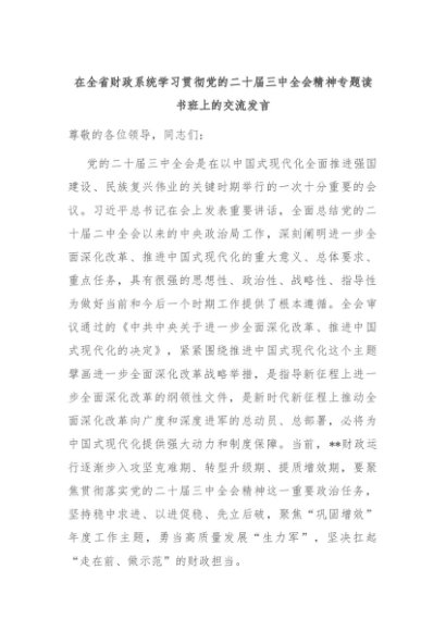 【七哥公文】2024年:在全省财政系统学习贯彻党的二十届三中全会精神专题读书班上的交流发言+更多免费公文+VX:QiGeGongWen2024