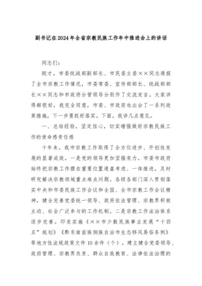 【七哥公文】2024年:副书记在2024年全省宗教民族工作年中推进会上的讲话+更多免费公文+VX:QiGeGongWen2024