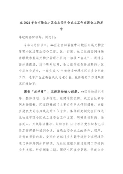 【七哥公文】2024年:在2024年全市物业小区业主委员会成立工作交流会上的发言+更多免费公文+VX:QiGeGongWen2024
