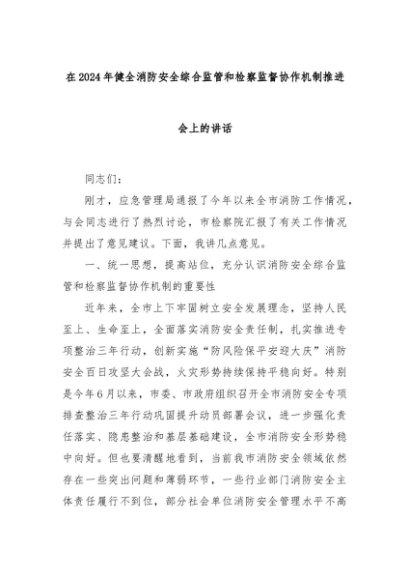 【七哥公文】2024年:在2024年健全消防安全综合监管和检察监督协作机制推进会上的讲话+更多免费公文+VX:QiGeGongWen2024