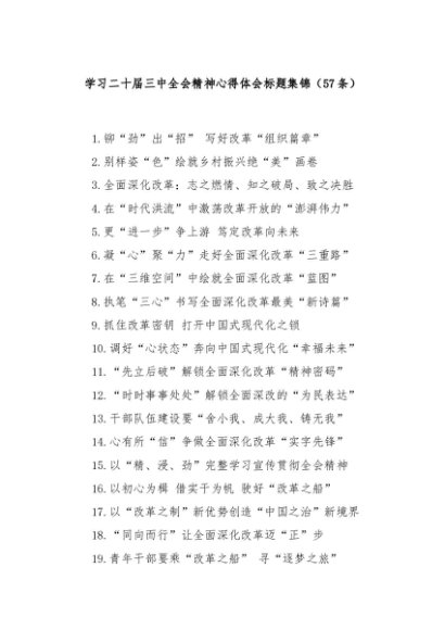 【七哥公文】2024年:学习二十届三中全会精神心得体会标题集锦(57条)+更多免费公文+VX:QiGeGongWen2024