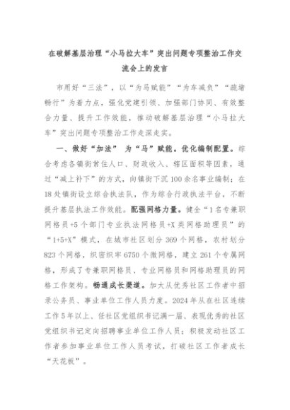 【七哥公文】2024年:在破解基层治理“小马拉大车”突出问题专项整治工作交流会上的发言+更多免费公文+VX:QiGeGongWen2024