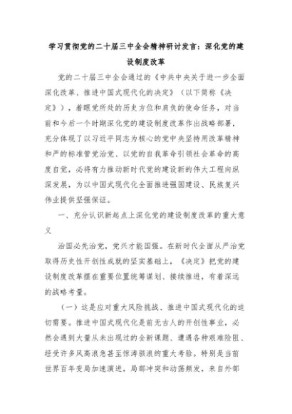 【七哥公文】2024年:学习贯彻党的二十届三中全会精神研讨发言:深化党的建设制度改革+更多免费公文+VX:QiGeGongWen2024
