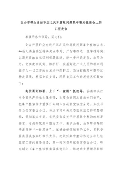 【七哥公文】2024年:在全市群众身边不正之风和腐败问题集中整治推进会上的汇报发言+更多免费公文+VX:QiGeGongWen2024