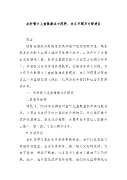 / 【七哥公文】2024年:农村留守儿童健康成长现状、存在问题及对策建议+更多免费公文+VX:QiGeGongWen2024