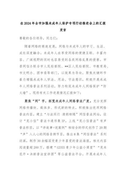 【七哥公文】2024年:在2024年全市加强未成年人保护专项行动推进会上的汇报发言+更多免费公文+VX:QiGeGongWen2024