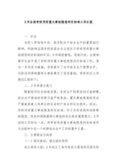 / 【七哥公文】2024年:X市全面学好用好重大事故隐患判定标准工作汇报+更多免费公文+VX:QiGeGongWen2024