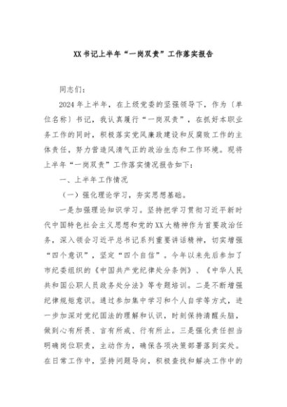 / 【七哥公文】2024年:XX书记上半年“一岗双责”工作落实报告+更多免费公文+VX:QiGeGongWen2024