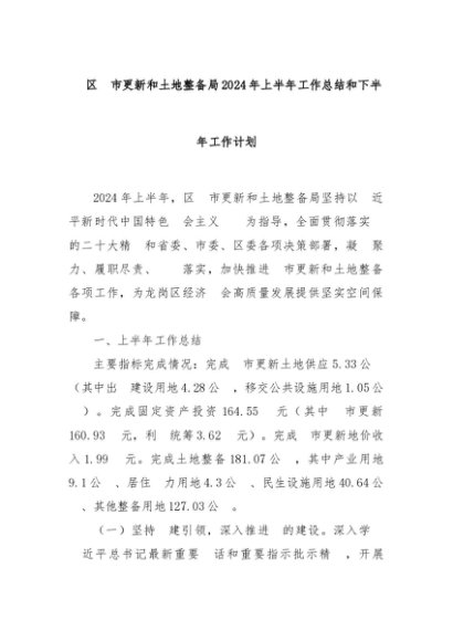 【七哥公文】2024年:XX区城市更新和土地整备局2024年上半年工作总结和下半年工作计划+更多免费公文+VX:QiGeGongWen2024