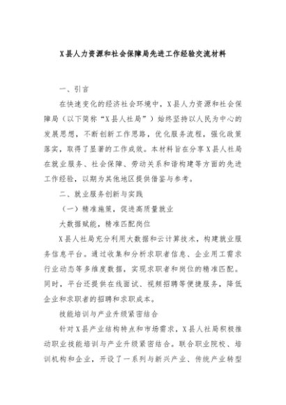/ 【七哥公文】2024年:X县人力资源和社会保障局先进工作经验交流材料+更多免费公文+VX:QiGeGongWen2024