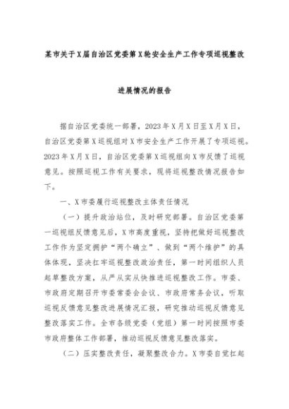 【七哥公文】2024年:某市关于X届自治区党委第X轮安全生产工作专项巡视整改进展情况的报告+更多免费公文+VX:QiGeGongWen2024