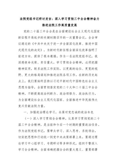 【七哥公文】2024年:法院党组书记研讨发言:深入学习贯彻三中全会精神奋力推进法院工作高质量发展+更多免费公文+VX:QiGeGongWen2024