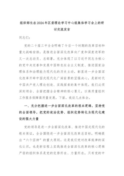 【七哥公文】2024年:组织部长在2024年区委理论学习中心组集体学习会上的研讨交流发言+更多免费公文+VX:QiGeGongWen2024
